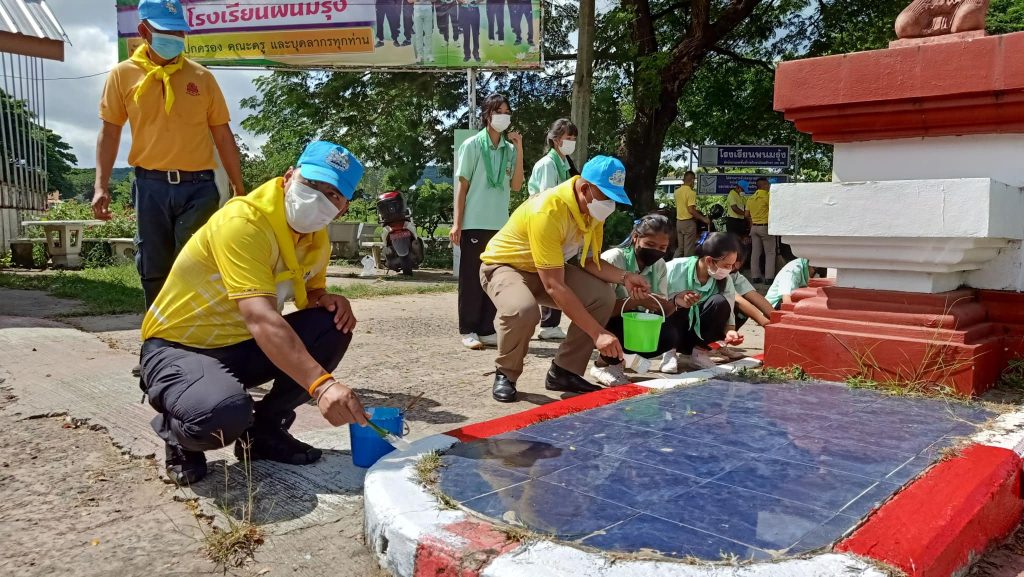 พ.ต.อ.มานิตย์ สร้อยจิตร ผกก.สภ.เฉลิมพระเกียรติ จว.บุรีรัมย์ พร้อมด้วย พ.ต.ท.รวีพันธ์ ปุยะติ รอง ผกก.ป.ฯ พ.ต.ต.วิทยา อินเที่ยง สวป.ฯ และข้าราชการตำรวจจิตอาสาพระราชทาน ในสังกัด จำนวน 10 นาย ร่วมทำกิจกรรมจิตอาสาบำเพ็ญประโยชน์ “ปรับปรุงทาสีเครื่องหมายจราจรบนขอบทาง ขาว-แดง บริเวณเกาะ ทางเท้า ในโรงเรียนพนมรุ้ง ต.ตาเป๊ก อ.เฉลิมพระเกียรติ จว.บุรีรัมย์