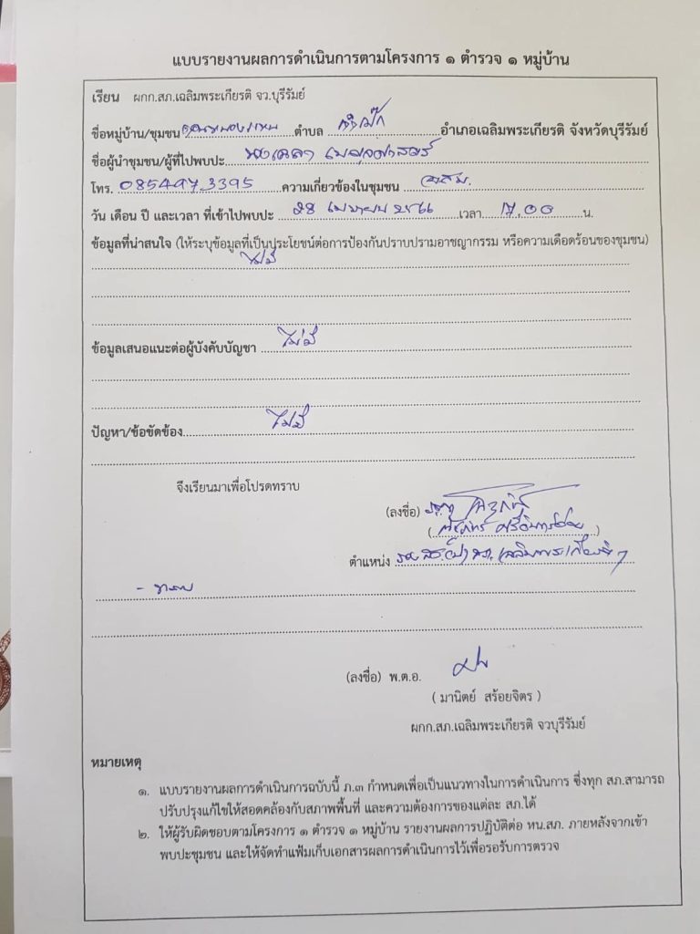 วันที่ 28 เม.ย.66 เวลา17.00 น. ร.ต.ท.ณัฐภัทร ศรีอินทร์อ่อน รอง สว.(ป)ฯ ตำรวจรับผิดชอบประจำหมู่บ้านดอนหนองแหน หมู่ที่ 2 ตำบล ตาเป๊กอำเภอเฉลิมพระเกียรติ จังหวัดบุรีรัมย์ ได้ออกพบปะผู้นำชุมชน สอบถามถึงปัญหาอาชญากรรมต่างๆ ภายในหมู่บ้าน ปรากฏว่าไม่มีปัญหาอาชญากรรมแต่อย่างใด เหตุการณ์ทั่วไปปกติ
