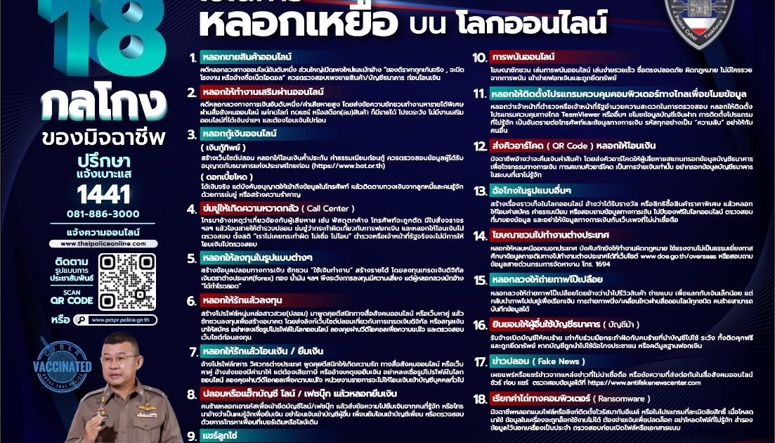 เตือนภัย !!! 18 กลโกง ของมิจฉาชีพ ที่ใช้ในการหลอกเหยื่อ บนโลกออนไลน์ 15 กันยายน 2022 โดย adminjohn / ข่าวประชาสัมพันธ์,ข่าวฝากประชาสัมพันธ์ PCT ศูนย์ปราบปรามอาชญากรรมทางเทคโนโลยีสารสนเทศ สำนักงานตำรวจแห่งชาติ (thaipoliceonline.com) เตือนภัยออนไลน์ อย่าตกเป็นเหยื่อ