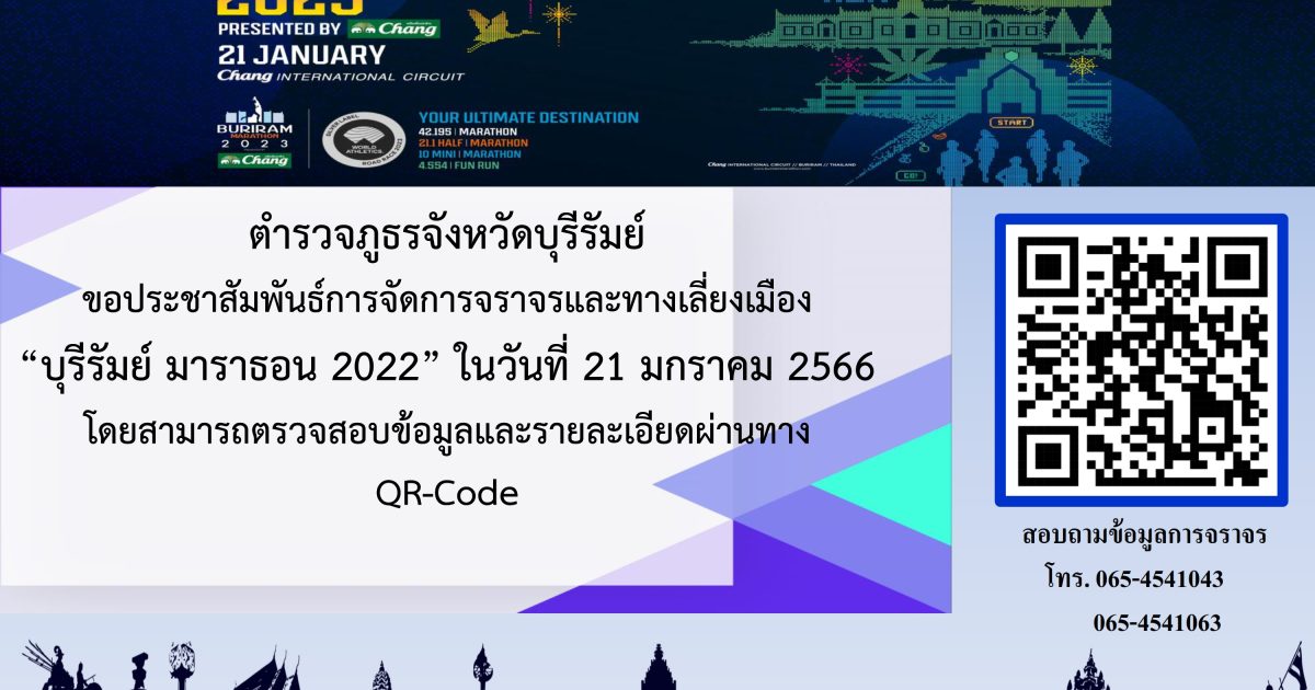 ข้อมูลการจัดการจราจรและทางเลี่ยงเมือง “บุรีรัมย์ มาราธอน 2023” วันที่ 21 มกราคม 2566 17 มกราคม 2023 โดย adminjohn / ข่าวประชาสัมพันธ์,ข่าวฝากประชาสัมพันธ์ การจัดการจราจรและทางเลี่ยงเมือง “บุรีรัมย์ มาราธอน 2023” 21 มกราคม 2566 – ตำรวจภูธรจังหวัดบุรีรัมย์ (police.go.th)