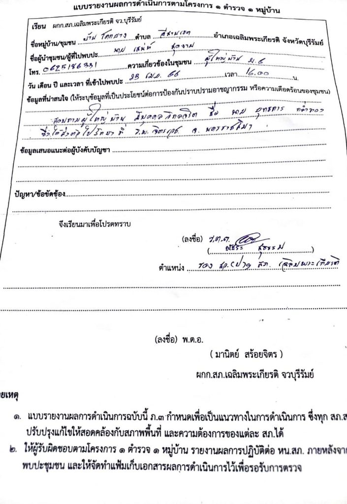 วันนี้ 23 เมษายน 66เวลาประมาณ 16.00น. ร.ต.ต. พัชระ สุธรรม รอง สว.(ป)ฯ สภ.เฉลิมพระเกียรติ ตำรวจรับผิดชอบหมู่บ้านโคกยาง ม.6 ต.อีสานเขตฯ อ.เฉลิมพระเกียรติ จ.บุรีรัมย์ ได้มาตรวจเยี่ยม นาย เสน่ห์ สุดงามผู้ใหญ่บ้าน บ.โคกยาง ม.6 ว่ามีบุคคลที่เป็นผู้ป่วยทางจิตในหมู่บ้าน หรือไม่ ผลการตรวจสอบพบว่ามีนาย ยุทธการ กล่ำทอง ซึ่งได้ส่งตัวไปรักษาที่ ร.พ.จิตรเวช จ.นครราชสีมา จึงได้แนะนำหากกลับมาแล้วให้แจ้งตำรวจหมู่บ้านทราบ เพื่อติดตามอาการต่อไป