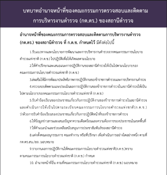 ที่มา : คู่มือการดำเนินการตามระเบียบ ก.ต.ช.ว่าด้วยคณะกรรมการตรวจสอบและติดตามการบริหารงานตำรวจ พ.ศ. 2546จาก https://www.boardofroyalthaipolice.go.th/th/pages/10256-%E0%B8%84%E0%B8%B9%